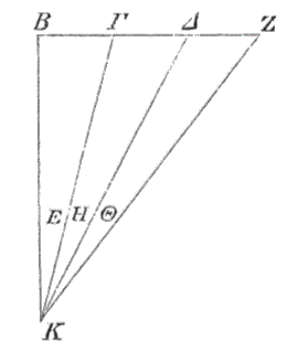 πάλιν ἐπεὶ μείζων ἡ ὑπὸ ΖΕΗ γωνία τῆς ὑπὸ ΘΕΚ γωνίας, μείζων ἄρα καὶ ἡ ΖΗ τῆς ΘΚ φαίνεται. μεῖζον ἄρα τὸ μὲν ΒΔ διάστημα τοῦ ΖΗ, τὸ δὲ ΖΗ τοῦ ΘΚ. οὐκέτι οὖν ὀφθήσεται παράλληλα ὄντα τὰ διαστήματα ἐπ’ ἴσης, ἀλλ’ ἀνισοπλατῆ.