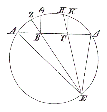 ἔστω κύκλος ὁ ΑΒΓΔ, καὶ ἤχθωσαν δύο διάμετροι αἱ ΑΓ, ΒΔ τέμνουσαι ἀλλήλας πρὸς ὀρθὰς κατὰ τὸ Ε σημεῖον, καὶ ἡ ἀπὸ τοῦ Ε σημείου ἀναγομένη, ἐφ’ ἧς τὸ ὄμμα κεῖται, ἡ ΖΕ μήτε πρὸς ὀρθὰς ἔστω τῷ ἐπιπέδῳ μήτε ἴση τῇ ἐκ τοῦ κέντρου μήτε ἴσας γωνίας περιέχουσα μετὰ τῶν ΑΓ, ΔΒ. λέγω, ὅτι ἄνισοι ὀφθήσονται αἱ ΑΓ, ΔΒ διάμετροι. ἐπεζεύχθωσαν γὰρ αἱ ΖΓ, ΖΑ, ΖΔ, ΖΒ. ἤτοι οὖν μείζων ἐστὶν ἡ ΕΖ τῆς ἐκ τοῦ κέντρου ἢ ἐλάσσων. διὰ ταῦτα δὴ ἤτοι μείζων ἐστὶν ἡ ὑπὸ ΔΖ, ΖΒ τῆς ὑπὸ ΓΖ, ΖΑ ἢ ἡ ὑπὸ τῶν ΓΖ, ΖΑ τῆς ὑπὸ ΔΖ, ΖΒ, ὡς ἑξῆς δείξομεν. ἄνισοι ἄρα αἱ διάμετροι ὀφθήσονται.