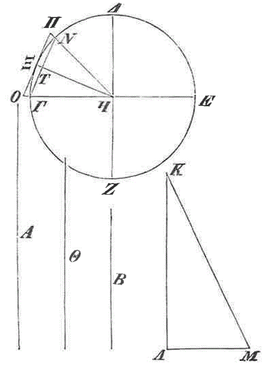 Εὑρήσθωσαν γὰρ δύο εὐθεῖαι αἱ Θ, ΚΛ, ὧν μείζων ἔστω ἡ Θ, ὥστε τὴν Θ πρὸς τὴν ΚΛ ἐλάσσονα λόγον [15] ἔχειν ἢ τὸ μεῖζον μέγεθος πρὸς τὸ ἔλαττον, καὶ ἤχθω ἀπὸ τοῦ Λ τῇ ΛΚ πρὸς ὀρθὰς ἡ ΛΜ, καὶ ἀπὸ τοῦ Κ τῇ Θ ἴση κατήχθω ἡ ΚΜ [δυνατὸν γὰρ τοῦτο], καὶ ἤχθωσαν τοῦ κύκλου δύο διάμετροι πρὸς ὀρθὰς ἀλλήλαις αἱ ΓΕ, ΔΖ. Τέμνοντες οὖν τὴν ὑπὸ τῶν ΔΗΓ γωνίαν δίχα καὶ τὴν ἡμίσειαν αὐτῆς δίχα καὶ αἰεὶ τοῦτο ποιοῦντες λείψομέν τινα γωνίαν ἐλάσσονα ἢ διπλασίαν τῆς ὑπὸ ΛΚΜ. Λελείφθω καὶ ἔστω ἡ ὑπὸ ΝΗΓ, καὶ ἐπεζεύχθω ἡ ΝΓ· ἡ ἄρα ΝΓ πολυγώνου ἐστὶ πλευρὰ ἰσοπλεύρου [ἐπείπερ ἡ ὑπὸ ΝΗΓ γωνία μετρεῖ τὴν ὑπὸ ΔΗΓ ὀρθὴν οὖσαν, καὶ ἡ ΝΓ ἄρα περιφέρεια μετρεῖ τὴν ΓΔ τέταρτον οὖσαν κύκλου· ὥστε καὶ τὸν κύκλον μετρεῖ. Πολυγώνου ἄρα ἐστὶ πλευρὰ ἰσοπλεύρου· φανερὸν γάρ ἐστι τοῦτο]. Καὶ τετμήσθω ἡ ὑπὸ ΓΗΝ γωνία δίχα τῇ ΗΞ εὐθείᾳ, καὶ ἀπὸ τοῦ Ξ ἐφαπτέσθω τοῦ κύκλου ἡ ΟΞΠ, καὶ ἐκβεβλήσθωσαν αἱ ΗΝΠ, ΗΓΟ· ὥστε καὶ ἡ ΠΟ πολυγώνου ἐστὶ πλευρὰ τοῦ περιγραφομένου περὶ τὸν κύκλον καὶ ἰσοπλεύρου [φανερὸν ὅτι καὶ ὁμοίου τῷ ἐγγραφομένῳ, οὗ πλευρὰ ἡ ΝΓ]. Ἐπεὶ δὲ ἐλάσσων ἐστὶν ἢ διπλασία ἡ ὑπὸ ΝΗΓ τῆς ὑπὸ ΛΚΜ, διπλασία δὲ τῆς ὑπὸ ΤΗΓ, ἐλάσσων ἄρα ἡ ὑπὸ ΤΗΓ τῆς ὑπὸ ΛΚΜ. Καί εἰσιν ὀρθαὶ αἱ πρὸς τοῖς Λ, Τ· ἡ ἄρα ΜΚ πρὸς ΛΚ μείζονα λόγον ἔχει ἤπερ ἡ ΓΗ πρὸς ΗΤ. Ἴση δὲ ἡ ΓΗ τῇ ΗΞ· ὥστε ἡ ΗΞ πρὸς ΗΤ ἐλάσσονα λόγον ἔχει, τουτέστιν ἡ ΠΟ πρὸς ΝΓ, ἤπερ ἡ ΜΚ πρὸς ΚΛ· ἔτι δὲ ἡ ΜΚ πρὸς ΚΛ ἐλάσσονα λόγον ἔχει ἤπερ τὸ Α πρὸς τὸ Β. Καί ἐστιν ἡ μὲν ΠΟ πλευρὰ τοῦ [16] περιγραφομένου πολυγώνου, ἡ δὲ ΓΝ τοῦ ἐγγραφομένου· ὅπερ προέκειτο εὑρεῖν.