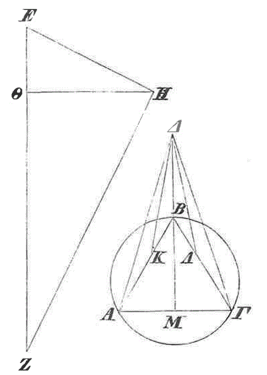 [128] Ἤχθω ἀπὸ τοῦ Ε τῇ ΕΓ πρὸς ὀρθὰς ἡ ΕΚ καὶ ἀπὸ τοῦ Β κάθετος ἐπ' αὐτὴν ἡ ΒΛ· ἐπίλοιπον ἡμῖν δεῖξαι δεῖ ὅτι ἡ ΗΘ πρὸς ΘΖ μείζονα λόγον ἔχει ἤπερ ἡ ΓΘ πρὸς ΘΒ. Ἴση δέ ἐστιν ἡ ΘΖ συναμφοτέρῳ τῇ ΑΘ, ΚΕ· δεῖξαι ἄρα δεῖ ὅτι ἡ ΗΘ πρὸς συναμφότερον τὴν ΘΑ, ΚΕ μείζονα λόγον ἔχει ἤπερ ἡ ΓΘ πρὸς ΘΒ· καὶ ἀφαιρεθείσης ἄρα ἀπὸ τῆς ΘΗ τῆς ΓΘ, ἀπὸ δὲ τῆς ΚΕ τῆς ΕΛ ἴσης τῇ ΒΘ, δεήσει δειχθῆναι ὅτι λοιπὴ ἡ ΓΗ πρὸς λοιπὴν συναμφότερον τὴν ΑΘ, ΚΛ μείζονα λόγον ἔχει ἤπερ ἡ ΓΘ πρὸς ΘΒ, τουτέστιν ἡ ΘΒ πρὸς ΘΑ, τουτέστιν ἡ ΛΕ πρὸς ΘΑ, καὶ ἐναλλάξ, ὅτι ἡ ΚΕ πρὸς ΕΛ μείζονα λόγον ἔχει ἤπερ συναμφότερος ἡ ΚΛ, ΘΑ πρὸς ΘΑ, καὶ διελόντι ἡ ΚΛ πρὸς ΛΕ μείζονα λόγον ἔχει ἤπερ ἡ ΚΛ πρὸς ΘΑ. Ὅτι ἐλάσσων ἐστὶν ἡ ΛΕ τῆς ΘΑ.