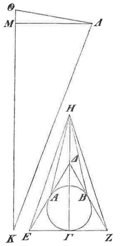 Ἤχθωσαν γὰρ κάθετοι αἱ ΔΚ, ΔΛ, ΔΜ· αὗται ἄρα ἴσαι ἀλλήλαις εἰσίν. Καὶ κείσθω τρίγωνον τὸ ΕΖΗ ἔχον τὴν μὲν ΕΖ βάσιν τῇ περιμέτρῳ τοῦ ΑΒΓ τριγώνου ἴσην, τὴν δὲ [22] ΗΘ κάθετον τῇ ΔΛ ἴσην. Ἐπεὶ οὖν τὸ ὑπὸ τῶν ΒΓ, ΔΛ διπλάσιόν ἐστι τοῦ ΔΒΓ τριγώνου, ἔστιν δὲ καὶ τὸ μὲν ὑπὸ τῶν ΑΒ, ΔΚ διπλάσιον τοῦ ΑΒΔ τριγώνου, τὸ δὲ ὑπὸ ΑΓ, ΔΜ διπλάσιον τοῦ ΑΔΓ τριγώνου, τὸ ἄρα ὑπὸ τῆς περιμέτρου τοῦ ΑΒΓ τριγώνου, τουτέστι τῆς ΕΖ, καὶ τῆς ΔΛ, τουτέστι τῆς ΗΘ, διπλάσιόν ἐστι τῶν ΑΔΒ, ΒΔΓ, ΑΔΓ τριγώνων. Ἔστι δὲ καὶ τὸ ὑπὸ ΕΖ, ΗΘ διπλάσιον τοῦ ΕΖΗ τριγώνου· ἴσον ἄρα τὸ ΕΖΗ τρίγωνον τοῖς ΑΔΒ, ΒΔΓ, ΑΔΓ τριγώνοις].