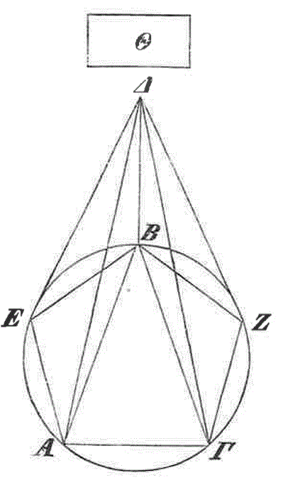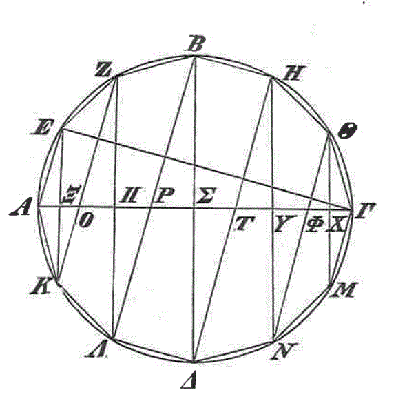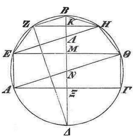 Ἐπεὶ γὰρ συναμφότερος ἡ ΒΑΛ μείζων ἐστὶ τῆς ΒΛ περιφερείας διὰ τὸ τὰ αὐτὰ πέρατα ἔχουσαν περιλαμβάνειν τὴν περιφέρειαν, ὁμοίως δὲ καὶ συναμφότερος μὲν ἡ ΔΓ, ΓΒ τῆς ΔΒ, συναμφότερος δὲ ἡ ΛΚ, ΚΘ τῆς ΛΘ, συναμφότερος δὲ ἡ ΖΗΘ τῆς ΖΘ, ἔτι δὲ συναμφότερος ἡ ΔΕ, ΕΖ τῆς ΔΖ, ὅλη ἄρα ἡ περίμετρος τοῦ πολυγώνου μείζων ἐστὶ τῆς περιφερείας τοῦ κύκλου.