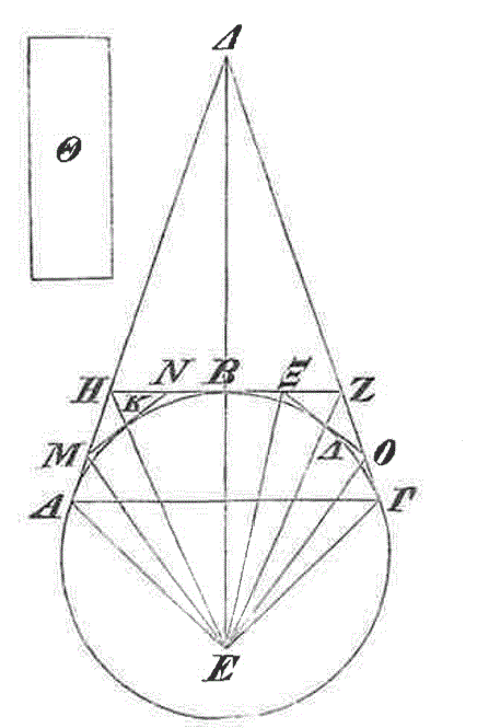 Εὑρήσθωσαν γὰρ δύο εὐθεῖαι αἱ Η, ΘΚ ἄνισοι καὶ μείζων ἡ Η, ὥστε τὴν Η πρὸς τὴν ΘΚ ἐλάσσονα λόγον ἔχειν ἢ τὸ μεῖζον μέγεθος πρὸς τὸ ἔλασσον [δυνατὸν γὰρ τοῦτο], καὶ ἀπὸ τοῦ Θ ὁμοίως ἀχθείσης πρὸς ὀρθὰς τῇ ΚΘ προσβεβλήσθω τῇ Η ἴση ἡ ΚΛ [δυνατὸν γάρ, ἐπεὶ [17] μείζων ἐστὶν ἡ Η τῆς ΘΚ]. Τεμνομένης δὴ τῆς ὑπὸ τῶν ΑΔΒ γωνίας δίχα καὶ τῆς ἡμισείας δίχα καὶ ἀεὶ τούτου γινομένου λειφθήσεταί τις γωνία ἐλάσσων οὖσα ἢ διπλασία τῆς ὑπὸ ΛΚΘ. Λελείφθω οὖν ἡ ὑπὸ ΑΔΜ· ἡ ΑΜ οὖν γίνεται πολυγώνου πλευρὰ ἐγγραφομένου εἰς τὸν κύκλον. Καὶ ἐὰν τέμωμεν τὴν ὑπὸ ΑΔΜ γωνίαν δίχα τῇ ΔΝ καὶ ἀπὸ τοῦ Ν ἀγάγωμεν ἐφαπτομένην τοῦ κύκλου τὴν ΝΞΟ, αὕτη πλευρὰ ἔσται τοῦ πολυγώνου τοῦ περιγραφομένου περὶ τὸν αὐτὸν κύκλον ὁμοίου τῷ εἰρημένῳ· καὶ ὁμοίως τοῖς προειρημένοις ἡ ΞΟ πρὸς τὴν ΑΜ ἐλάσσονα λόγον ἔχει ἤπερ τὸ Ε μέγεθος πρὸς τὸ Ζ.