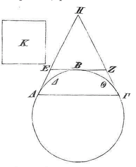 Εἰ δὲ μή ἐστιν μεῖζον τὸ ἥμισυ τοῦ Κ χωρίου τῶν εἰρημένων σχημάτων, ἀχθήσονται εὐθεῖαι ἐπιψαύουσαι τοῦ τμήματος, ὥστε γενέσθαι τὰ περιλειπόμενα σχήματα ἐλάσσονα τοῦ ἡμίσους τοῦ Κ, καὶ τὰ ἄλλα τὰ αὐτὰ τοῖς ἔμπροσθεν δειχθήσεται.
