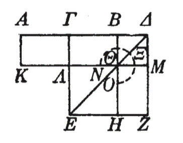 Ἀναγεγράφθω γὰρ ἀπὸ τῆς ΓΔ τετράγωνον τὸ ΓΕΖΔ, καὶ ἐπεζεύχθω ἡ ΔΕ, καὶ διὰ μὲν τοῦ Β σημείου ὁποτέρᾳ τῶν ΕΓ, ΔΖ παράλληλος ἤχθω ἡ ΒΗ, διὰ δὲ τοῦ Θ σημείου ὁποτέρᾳ τῶν ΑΒ, ΕΖ παράλληλος ἤχθω ἡ ΚΜ, καὶ ἔτι διὰ τοῦ Α ὁποτέρᾳ τῶν ΓΛ, ΔΜ παράλληλος ἤχθω ἡ ΑΚ.