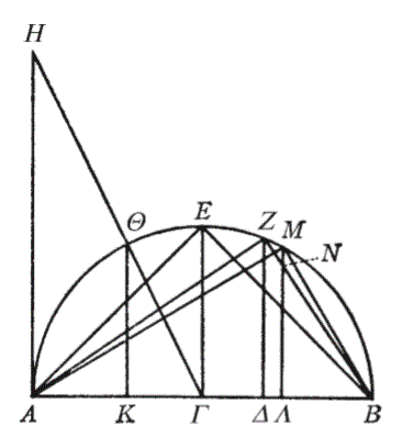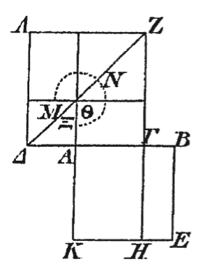 [3]    Ἐὰν εὐθεῖα γραμμὴ ἄκρον καὶ μέσον λόγον τμηθῇ, τὸ ἔλασσον τμῆμα προσλαβὸν τὴν ἡμίσειαν τοῦ μείζονος τμήματος πενταπλάσιον δύναται τοῦ ἀπὸ τῆς ἡμισείας τοῦ μείζονος τμήματος τετραγώνου.