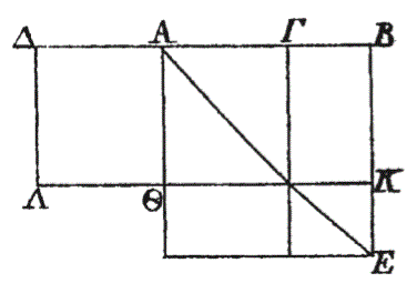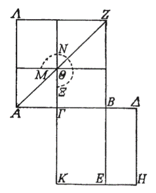Ἀναγεγράφθω γὰρ ἀπὸ τῆς ΑΒ τετράγωνον τὸ ΑΔΕΒ, καὶ καταγεγράφθω τὸ σχῆμα. ἐπεὶ οὖν ἡ ΑΒ ἄκρον καὶ μέσον λόγον τέτμηται κατὰ τὸ Γ, καὶ τὸ μεῖζον τμῆμά ἐστιν ἡ ΑΓ, τὸ ἄρα ὑπὸ τῶν ΑΒΓ ἴσον ἐστὶ τῷ ἀπὸ τῆς ΑΓ. καί ἐστι τὸ μὲν ὑπὸ τῶν ΑΒΓ τὸ ΑΚ, τὸ δὲ ἀπὸ τῆς ΑΓ τὸ ΘΗ· ἴσον ἄρα ἐστὶ τὸ ΑΚ τῷ ΘΗ. καὶ ἐπεὶ ἴσον ἐστὶ τὸ ΑΖ τῷ ΖΕ, κοινὸν προσκείσθω τὸ ΓΚ· ὅλον ἄρα τὸ ΑΚ ὅλῳ τῷ ΓΕ ἐστιν ἴσον· τὰ ἄρα ΑΚ, ΓΕ τοῦ ΑΚ ἐστι διπλάσια. ἀλλὰ τὰ ΑΚ, ΓΕ ὁ ΛΜΝ γνώμων ἐστὶ καὶ τὸ ΓΚ τετράγωνον· ὁ ἄρα ΛΜΝ γνώμων καὶ τὸ ΓΚ τετράγωνον διπλάσιά ἐστι τοῦ ΑΚ. ἀλλὰ μὴν καὶ τὸ ΑΚ τῷ ΘΗ ἐδείχθη ἴσον· ὁ ἄρα ΛΜΝ γνώμων καὶ [τὸ ΓΚ τετράγωνον διπλάσιά ἐστι τοῦ ΘΗ· ὥστε ὁ ΛΜΝ γνώμων καὶ] τὰ ΓΚ, ΘΗ τετράγωνα τριπλάσιά ἐστι τοῦ ΘΗ τετραγώνου. καί ἐστιν ὁ [μὲν] ΛΜΝ γνώμων καὶ τὰ ΓΚ, ΘΗ τετράγωνα ὅλον τὸ ΑΕ καὶ τὸ ΓΚ, ἅπερ ἐστὶ τὰ ἀπὸ τῶν ΑΒ, ΒΓ τετράγωνα, τὸ δὲ ΗΘ τὸ ἀπὸ τῆς ΑΓ τετράγωνον. τὰ ἄρα ἀπὸ τῶν ΑΒ, ΒΓ τετράγωνα τριπλάσιά ἐστι τοῦ ἀπὸ τῆς ΑΓ τετραγώνου· ὅπερ ἔδει δεῖξαι.
