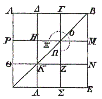 [1]   Ἐὰν εὐθεῖα γραμμὴ ἄκρον καὶ μέσον λόγον τμηθῇ, τὸ μεῖζον τμῆμα προσλαβὸν τὴν ἡμίσειαν τῆς ὅλης πενταπλάσιον δύναται τοῦ ἀπὸ τῆς ἡμισείας τετραγώνου.
