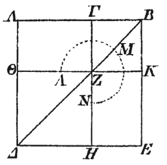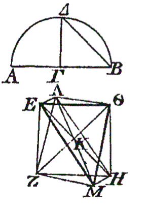 [14]    Ὀκτάεδρον συστήσασθαι καὶ σφαίρᾳ περιλαβεῖν, ᾗ καὶ τὰ πρότερα, καὶ δεῖξαι, ὅτι ἡ τῆς σφαίρας διάμετρος δυνάμει διπλασία ἐστὶ τῆς πλευρᾶς τοῦ ὀκταέδρου.