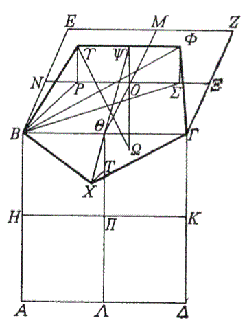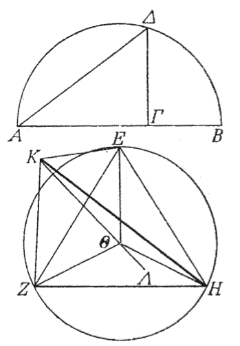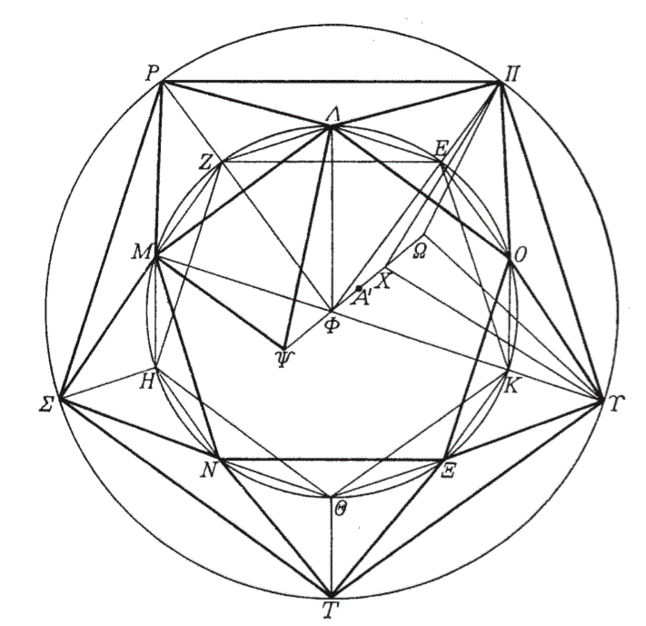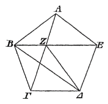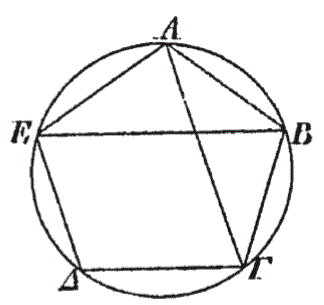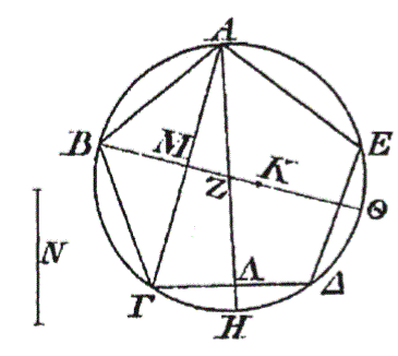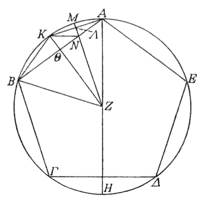 [10]    Ἐὰν εἰς κύκλον πεντάγωνον ἰσόπλευρον ἐγγραφῇ, ἡ τοῦ πενταγώνου πλευρὰ δύναται τήν τε τοῦ ἑξαγώνου καὶ τὴν τοῦ δεκαγώνου τῶν εἰς τὸν αὐτὸν κύκλον ἐγγραφομένων.