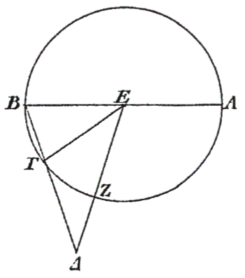 Εἰλήφθω γὰρ τὸ κέντρον τοῦ ΑΒΓ κύκλου τὸ Δ, καὶ ἐπιζευχθεῖσα ἡ ΑΔ διήχθω ἐπὶ τὸ Ε, καὶ ἐπεζεύχθω ἡ ΒΕ. καὶ ἐπεὶ ἰσόπλευρόν ἐστι τὸ ΑΒΓ τρίγωνον, ἡ ΒΕΓ ἄρα περιφέρεια τρίτον μέρος ἐστὶ τῆς τοῦ ΑΒΓ κύκλου περιφερείας. ἡ ἄρα ΒΕ περιφέρεια ἕκτον ἐστὶ μέρος τῆς τοῦ κύκλου περιφερείας· ἑξαγώνου ἄρα ἐστὶν ἡ ΒΕ εὐθεῖα· ἴση ἄρα ἐστὶ τῇ ἐκ τοῦ κέντρου τῇ ΔΕ. καὶ ἐπεὶ διπλῆ ἐστιν ἡ ΑΕ τῆς ΔΕ, τετραπλάσιόν ἐστι τὸ ἀπὸ τῆς ΑΕ τοῦ ἀπὸ τῆς ΕΔ, τουτέστι τοῦ ἀπὸ τῆς ΒΕ. ἴσον δὲ τὸ ἀπὸ τῆς ΑΕ τοῖς ἀπὸ τῶν ΑΒ, ΒΕ· τὰ ἄρα ἀπὸ τῶν ΑΒ, ΒΕ τετραπλάσιά ἐστι τοῦ ἀπὸ τῆς ΒΕ. διελόντι ἄρα τὸ ἀπὸ τῆς ΑΒ τριπλάσιόν ἐστι τοῦ ἀπὸ ΒΕ. ἴση δὲ ἡ ΒΕ τῇ ΔΕ· τὸ ἄρα ἀπὸ τῆς ΑΒ τριπλάσιόν ἐστι τοῦ ἀπὸ τῆς ΔΕ.