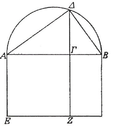 Ἐκκείσθω γὰρ ἡ τοῦ ἡμικυκλίου καταγραφή, καὶ ἐπεζεύχθω ἡ ΔΒ, καὶ ἀναγεγράφθω ἀπὸ τῆς ΑΓ τετράγωνον τὸ ΕΓ, καὶ συμπεπληρώσθω τὸ ΖΒ παραλληλόγραμμον. ἐπεὶ οὖν διὰ τὸ ἰσογώνιον εἶναι τὸ ΔΑΒ τρίγωνον τῷ ΔΑΓ τριγώνῳ ἐστὶν ὡς ἡ ΒΑ πρὸς τὴν ΑΔ, οὕτως ἡ ΔΑ πρὸς τὴν ΑΓ, τὸ ἄρα ὑπὸ τῶν ΒΑ, ΑΓ ἴσον ἐστὶ τῷ ἀπὸ τῆς ΑΔ. καὶ ἐπεί ἐστιν ὡς ἡ ΑΒ πρὸς τὴν ΒΓ, οὕτως τὸ ΕΒ πρὸς τὸ ΒΖ, καί ἐστι τὸ μὲν ΕΒ τὸ ὑπὸ τῶν ΒΑ, ΑΓ· ἴση γὰρ ἡ ΕΑ τῇ ΑΓ· τὸ δὲ ΒΖ τὸ ὑπὸ τῶν ΑΓ, ΓΒ, ὡς ἄρα ἡ ΑΒ πρὸς τὴν ΒΓ, οὕτως τὸ ὑπὸ τῶν ΒΑ, ΑΓ πρὸς τὸ ὑπὸ τῶν ΑΓ, ΓΒ. καί ἐστι τὸ μὲν ὑπὸ τῶν ΒΑ, ΑΓ ἴσον τῷ ἀπὸ τῆς ΑΔ, τὸ δὲ ὑπὸ τῶν ΑΓΒ ἴσον τῷ ἀπὸ τῆς ΔΓ· ἡ γὰρ ΔΓ κάθετος τῶν τῆς βάσεως τμημάτων τῶν ΑΓ, ΓΒ μέση ἀνάλογόν ἐστι διὰ τὸ ὀρθὴν εἶναι τὴν ὑπὸ ΑΔΒ. ὡς ἄρα ἡ ΑΒ πρὸς τὴν ΒΓ, οὕτως τὸ ἀπὸ τῆς ΑΔ πρὸς τὸ ἀπὸ τῆς ΔΓ· ὅπερ ἔδει δεῖξαι.