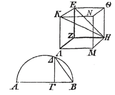 Ἐκκείσθω ἡ τῆς δοθείσης σφαίρας διάμετρος ἡ ΑΒ καὶ τετμήσθω κατὰ τὸ Γ ὥστε διπλῆν εἶναι τὴν ΑΓ τῆς ΓΒ, καὶ γεγράφθω ἐπὶ τῆς ΑΒ ἡμικύκλιον τὸ ΑΔΒ, καὶ ἀπὸ τοῦ Γ τῇ ΑΒ πρὸς ὀρθὰς ἤχθω ἡ ΓΔ, καὶ ἐπεζεύχθω ἡ ΔΒ, καὶ ἐκκείσθω τετράγωνον τὸ ΕΖΗΘ ἴσην ἔχον τὴν πλευρὰν τῇ ΔΒ, καὶ ἀπὸ τῶν Ε, Ζ, Η, Θ τῷ τοῦ ΕΖΗΘ τετραγώνου ἐπιπέδῳ πρὸς ὀρθὰς ἤχθωσαν αἱ ΕΚ, ΖΛ, ΗΜ, ΘΝ, καὶ ἀφῃρήσθω ἀπὸ ἑκάστης τῶν ΕΚ, ΖΛ, ΗΜ, ΘΝ μιᾷ τῶν ΕΖ, ΖΗ, ΗΘ, ΘΕ ἴση ἑκάστη τῶν ΕΚ, ΖΛ, ΗΜ, ΘΝ, καὶ ἐπεζεύχθωσαν αἱ ΚΛ, ΛΜ, ΜΝ, ΝΚ· κύβος ἄρα συνέσταται ὁ ΖΝ ὑπὸ ἓξ τετραγώνων ἴσων περιεχόμενος. δεῖ δὴ αὐτὸν καὶ σφαίρᾳ περιλαβεῖν τῇ δοθείσῃ καὶ δεῖξαι, ὅτι ἡ τῆς σφαίρας διάμετρος δυνάμει τριπλασία ἐστὶ τῆς πλευρᾶς τοῦ κύβου.