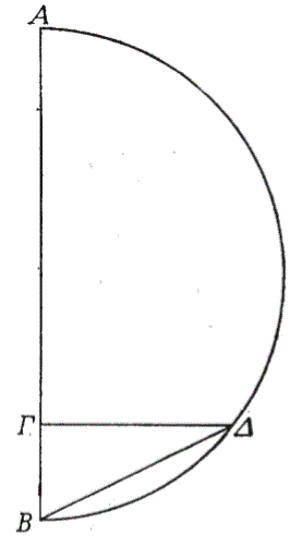 Ἐπεὶ γὰρ διπλῆ ἐστιν ἡ ΑΓ τῆς ΓΒ, τριπλῆ ἄρα ἐστὶν ἡ ΑΒ τῆς ΒΓ· ἀναστρέψαντι ἡμιολία ἄρα ἐστὶν ἡ ΒΑ τῆς ΑΓ. ὡς δὲ ἡ ΒΑ πρὸς τὴν ΑΓ, οὕτως τὸ ἀπὸ τῆς ΒΑ πρὸς τὸ ἀπὸ τῆς ΑΔ [ἐπειδήπερ ἐπιζευγνυμένης τῆς ΔΒ ἐστιν ὡς ἡ ΒΑ πρὸς τὴν ΑΔ, οὕτως ἡ ΔΑ πρὸς τὴν ΑΓ διὰ τὴν ὁμοιότητα τῶν ΔΑΒ, ΔΑΓ τριγώνων, καὶ εἶναι ὡς τὴν πρώτην πρὸς τὴν τρίτην, οὕτως τὸ ἀπὸ τῆς πρώτης πρὸς τὸ ἀπὸ τῆς δευτέρας]. ἡμιόλιον ἄρα καὶ τὸ ἀπὸ τῆς ΒΑ τοῦ ἀπὸ τῆς ΑΔ. καί ἐστιν ἡ μὲν ΒΑ ἡ τῆς δοθείσης σφαίρας διάμετρος, ἡ δὲ ΑΔ ἴση τῇ πλευρᾷ τῆς πυραμίδος.
