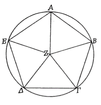 Ἔστω γὰρ πεντάγωνον ἰσόπλευρον καὶ ἰσογώνιον τὸ ΑΒΓΔΕ, καὶ περιγεγράφθω περὶ αὐτὸ κύκλος ὁ ΑΒΓ ΔΕ, καὶ εἰλήφθω αὐτοῦ τὸ κέντρον τὸ Ζ, καὶ ἐπεζεύχθωσαν αἱ ΖΑ, ΖΒ, ΖΓ, ΖΔ, ΖΕ. δίχα ἄρα τέμνουσι τὰς πρὸς τοῖς Α, Β, Γ, Δ, Ε τοῦ πενταγώνου γωνίας. καὶ ἐπεὶ αἱ πρὸς τῷ Ζ πέντε γωνίαι τέσσαρσιν ὀρθαῖς ἴσαι εἰσὶ καί εἰσιν ἴσαι, μία ἄρα αὐτῶν, ὡς ἡ ὑπὸ ΑΖΒ, μιᾶς ὀρθῆς ἐστι παρὰ πέμπτον· λοιπαὶ ἄρα αἱ ὑπὸ ΖΑΒ, ΑΒΖ μιᾶς εἰσιν ὀρθῆς καὶ πέμπτου. ἴση δὲ ἡ ὑπὸ ΖΑΒ τῇ ὑπὸ ΖΒΓ· καὶ ὅλη ἄρα ἡ ὑπὸ ΑΒΓ τοῦ πενταγώνου γωνία μιᾶς ἐστιν ὀρθῆς καὶ πέμπτου· ὅπερ ἔδει δεῖξαι.
