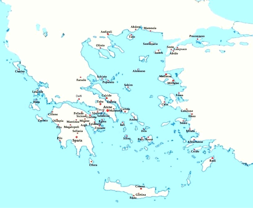 Ecco una mappa essenziale in cui sono riportate le città più importanti della Grecia antica. Osservala attentamente, se intendi affrontare il test interattivo sulla collocazione geografica delle città greche.