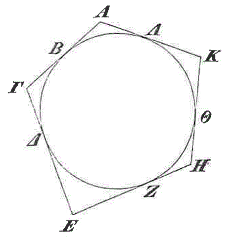Ἐπεὶ γὰρ συναμφότερος ἡ ΒΑΛ μείζων ἐστὶ τῆς ΒΛ περιφερείας διὰ τὸ τὰ αὐτὰ πέρατα ἔχουσαν περιλαμβάνειν τὴν περιφέρειαν, ὁμοίως δὲ καὶ συναμφότερος μὲν ἡ ΔΓ, ΓΒ τῆς ΔΒ, συναμφότερος δὲ ἡ ΛΚ, ΚΘ τῆς ΛΘ, συναμφότερος δὲ ἡ ΖΗΘ τῆς ΖΘ, ἔτι δὲ συναμφότερος ἡ ΔΕ, ΕΖ τῆς ΔΖ, ὅλη ἄρα ἡ περίμετρος τοῦ πολυγώνου μείζων ἐστὶ τῆς περιφερείας τοῦ κύκλου.