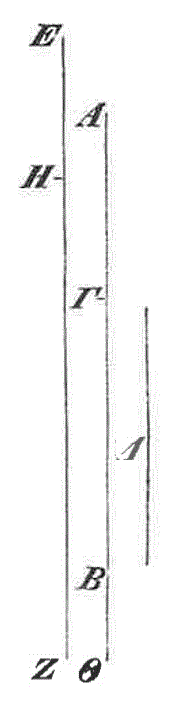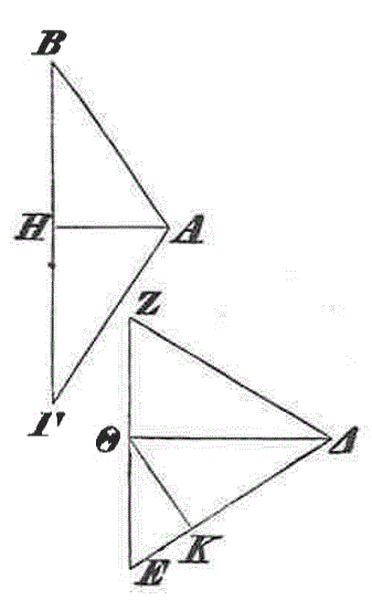[128] Ἤχθω ἀπὸ τοῦ Ε τῇ ΕΓ πρὸς ὀρθὰς ἡ ΕΚ καὶ ἀπὸ τοῦ Β κάθετος ἐπ' αὐτὴν ἡ ΒΛ· ἐπίλοιπον ἡμῖν δεῖξαι δεῖ ὅτι ἡ ΗΘ πρὸς ΘΖ μείζονα λόγον ἔχει ἤπερ ἡ ΓΘ πρὸς ΘΒ. Ἴση δέ ἐστιν ἡ ΘΖ συναμφοτέρῳ τῇ ΑΘ, ΚΕ· δεῖξαι ἄρα δεῖ ὅτι ἡ ΗΘ πρὸς συναμφότερον τὴν ΘΑ, ΚΕ μείζονα λόγον ἔχει ἤπερ ἡ ΓΘ πρὸς ΘΒ· καὶ ἀφαιρεθείσης ἄρα ἀπὸ τῆς ΘΗ τῆς ΓΘ, ἀπὸ δὲ τῆς ΚΕ τῆς ΕΛ ἴσης τῇ ΒΘ, δεήσει δειχθῆναι ὅτι λοιπὴ ἡ ΓΗ πρὸς λοιπὴν συναμφότερον τὴν ΑΘ, ΚΛ μείζονα λόγον ἔχει ἤπερ ἡ ΓΘ πρὸς ΘΒ, τουτέστιν ἡ ΘΒ πρὸς ΘΑ, τουτέστιν ἡ ΛΕ πρὸς ΘΑ, καὶ ἐναλλάξ, ὅτι ἡ ΚΕ πρὸς ΕΛ μείζονα λόγον ἔχει ἤπερ συναμφότερος ἡ ΚΛ, ΘΑ πρὸς ΘΑ, καὶ διελόντι ἡ ΚΛ πρὸς ΛΕ μείζονα λόγον ἔχει ἤπερ ἡ ΚΛ πρὸς ΘΑ. Ὅτι ἐλάσσων ἐστὶν ἡ ΛΕ τῆς ΘΑ.