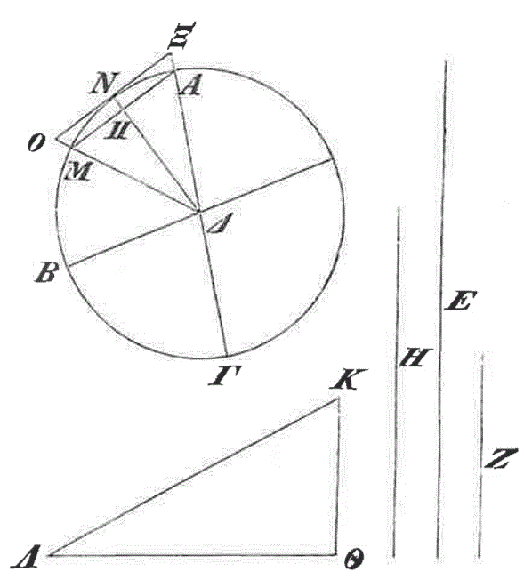 Εὑρήσθωσαν γὰρ δύο εὐθεῖαι αἱ Η, ΘΚ ἄνισοι καὶ μείζων ἡ Η, ὥστε τὴν Η πρὸς τὴν ΘΚ ἐλάσσονα λόγον ἔχειν ἢ τὸ μεῖζον μέγεθος πρὸς τὸ ἔλασσον [δυνατὸν γὰρ τοῦτο], καὶ ἀπὸ τοῦ Θ ὁμοίως ἀχθείσης πρὸς ὀρθὰς τῇ ΚΘ προσβεβλήσθω τῇ Η ἴση ἡ ΚΛ [δυνατὸν γάρ, ἐπεὶ [17] μείζων ἐστὶν ἡ Η τῆς ΘΚ]. Τεμνομένης δὴ τῆς ὑπὸ τῶν ΑΔΒ γωνίας δίχα καὶ τῆς ἡμισείας δίχα καὶ ἀεὶ τούτου γινομένου λειφθήσεταί τις γωνία ἐλάσσων οὖσα ἢ διπλασία τῆς ὑπὸ ΛΚΘ. Λελείφθω οὖν ἡ ὑπὸ ΑΔΜ· ἡ ΑΜ οὖν γίνεται πολυγώνου πλευρὰ ἐγγραφομένου εἰς τὸν κύκλον. Καὶ ἐὰν τέμωμεν τὴν ὑπὸ ΑΔΜ γωνίαν δίχα τῇ ΔΝ καὶ ἀπὸ τοῦ Ν ἀγάγωμεν ἐφαπτομένην τοῦ κύκλου τὴν ΝΞΟ, αὕτη πλευρὰ ἔσται τοῦ πολυγώνου τοῦ περιγραφομένου περὶ τὸν αὐτὸν κύκλον ὁμοίου τῷ εἰρημένῳ· καὶ ὁμοίως τοῖς προειρημένοις ἡ ΞΟ πρὸς τὴν ΑΜ ἐλάσσονα λόγον ἔχει ἤπερ τὸ Ε μέγεθος πρὸς τὸ Ζ.