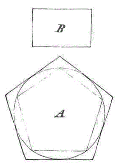 Δεδόσθω κύκλος ὁ Α καὶ χωρίον τι τὸ Β. Δυνατὸν δὴ περιγράψαι περὶ τὸν κύκλον πολύγωνον, ὥστε τὰ ἀπολειφθέντα τμήματα μεταξὺ τοῦ κύκλου καὶ τοῦ πολυγώνου ἐλάσσονα εἶναι τοῦ Β χωρίου· καὶ γὰρ ὄντων δύο μεγεθῶν ἀνίσων, μείζονος μὲν συναμφοτέρου τοῦ τε χωρίου καὶ τοῦ κύκλου, ἐλάσσονος δὲ τοῦ κύκλου, περιγεγράφθω περὶ τὸν κύκλον πολύγωνον καὶ ἄλλο ἐγγεγράφθω, ὥστε τὸ περιγραφὲν πρὸς τὸ ἐγγραφὲν ἐλάσσονα λόγον ἔχειν [20] ἢ τὸ εἰρημένον μεῖζον μέγεθος πρὸς τὸ ἔλασσον. Τοῦτο δὴ τὸ περιγραφόμενον πολύγωνόν ἐστιν, οὗ τὰ περιλείμματα ἔσται ἐλάσσονα τοῦ προτεθέντος χωρίου τοῦ Β.
