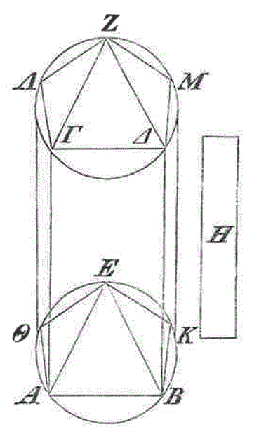 Καὶ ἐπεί ἐστιν, ὡς ἡ ΓΔ πρὸς ΗΘ, ἡ ΜΝ πρὸς ΕΖ, καὶ ἐναλλάξ, καὶ ἴση ἡ ΗΘ τῇ ΚΛ [ὡς ἄρα ἡ ΓΔ πρὸς ΜΝ, τουτέστιν ὡς τὸ ἀπὸ τῆς ΓΔ πρὸς τὸ ἀπὸ ΗΘ, οὕτως ὁ Ε κύκλος πρὸς τὸν Κ κύκλον], ὡς ἄρα ὁ Ε κύκλος πρὸς τὸν Κ κύκλον, οὕτως ἡ ΚΔ πρὸς τὴν ΕΖ [τῶν ἄρα Ε, Κ κυλίνδρων [104] ἀντιπεπόνθασιν αἱ βάσεις τοῖς ὕψεσιν]· ἴσος ἄρα ὁ Ε κύλινδρος τῷ Κ κυλίνδρῳ. Ὁ δὲ Κ κύλινδρος τῆς σφαίρας, ἧς διάμετρος ἡ ΗΘ, ἡμιόλιός ἐστιν· καὶ ἡ σφαῖρα ἄρα, ἧς ἡ διάμετρος ἴση ἐστὶ τῇ ΗΘ, τουτέστιν ἡ Β, ἴση ἐστὶ τῷ Α κώνῳ ἢ κυλίνδρῳ.