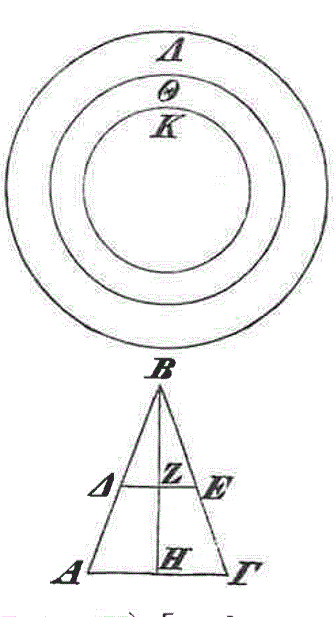 [47] Ἐκκείσθωσαν γὰρ κύκλοι οἱ Λ, Κ, καὶ τοῦ μὲν Κ κύκλου ἡ ἐκ τοῦ κέντρου δυνάσθω τὸ ὑπὸ ΒΔΖ, τοῦ δὲ Λ ἡ ἐκ τοῦ κέντρου δυνάσθω τὸ ὑπὸ ΒΑΗ· ὁ μὲν ἄρα Λ κύκλος ἴσος ἐστὶν τῇ ἐπιφανείᾳ τοῦ ΑΒΓ κώνου, ὁ δὲ Κ κύκλος ἴσος ἐστὶ τῇ ἐπιφανείᾳ τοῦ ΔΕΒ. Καὶ ἐπεὶ τὸ ὑπὸ τῶν ΒΑ, ΑΗ ἴσον ἐστὶ τῷ τε ὑπὸ τῶν ΒΔ, ΔΖ καὶ τῷ ὑπὸ τῆς ΑΔ καὶ συναμφοτέρου τῆς ΔΖ, ΑΗ διὰ τὸ παράλληλον εἶναι τὴν ΔΖ τῇ ΑΗ, ἀλλὰ τὸ μὲν ὑπὸ ΑΒ, ΑΗ δύναται ἡ ἐκ τοῦ κέντρου τοῦ Λ κύκλου, τὸ δὲ ὑπὸ ΒΔ, ΔΖ δύναται ἡ ἐκ τοῦ κέντρου τοῦ Κ κύκλου, τὸ δὲ ὑπὸ τῆς ΔΑ καὶ συναμφοτέρου τῆς ΔΖ, ΑΗ δύναται ἡ ἐκ τοῦ κέντρου τοῦ Θ, τὸ ἄρα ἀπὸ τῆς ἐκ τοῦ κέντρου τοῦ Λ κύκλου ἴσον ἐστὶ τοῖς ἀπὸ τῶν ἐκ τῶν κέντρων τῶν Κ, Θ κύκλων· ὥστε καὶ ὁ Λ κύκλος ἴσος ἐστὶ τοῖς Κ, Θ κύκλοις. Ἀλλ' ὁ μὲν Λ ἴσος ἐστὶ τῇ ἐπιφανείᾳ τοῦ ΒΑΓ κώνου, ὁ δὲ Κ τῇ ἐπιφανείᾳ τοῦ ΔΒΕ κώνου· λοιπὴ ἄρα ἡ ἐπιφάνεια τοῦ κώνου ἡ μεταξὺ τῶν παραλλήλων ἐπιπέδων τῶν ΔΕ, ΑΓ ἴση ἐστὶ τῷ Θ κύκλῳ.