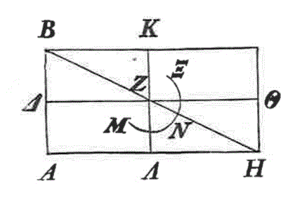 Τετμήσθω γὰρ ἑκατέρα τῶν ΑΒ, ΓΔ δίχα κατὰ τὰ Ε, Ζ σημεῖα, καὶ ἐπεζεύχθωσαν αἱ ΑΕ, ΕΒ, ΓΖ, ΖΔ. Καὶ ἐπεὶ [31] αἱ ΑΕ, ΕΒ τῆς ΑΒ [διαμέτρου] μείζους εἰσίν, καί ἐστιν ἰσουψῆ τὰ παραλληλόγραμμα τὰ ἐπ' αὐτῶν, μείζονα οὖν ἐστιν τὰ παραλληλόγραμμα, ὧν [αἱ] βάσεις μὲν αἱ ΑΕ, ΕΒ, ὕψος δὲ τὸ αὐτὸ τῷ κυλίνδρῳ, τοῦ ΑΒΔΓ παραλληλογράμμου. Τίνι ἄρα μείζονά ἐστιν; Ἔστω τῷ Η χωρίῳ. Τὸ δὴ Η χωρίον ἤτοι ἔλασσον τῶν ΑΕ, ΕΒ, ΓΖ, ΖΔ ἐπιπέδων ἐστὶ τμημάτων ἢ οὐκ ἔλασσον.