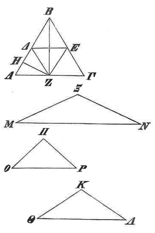 [21] Ἐπεὶ γὰρ ἰσοσκελὴς ὁ κῶνος, καὶ ἰσόπλευρος ἡ βάσις τῆς πυραμίδος, τὰ ὕψη τῶν περιεχόντων τριγώνων τὴν πυραμίδα ἴσα ἐστὶν ἀλλήλοις. Καὶ βάσιν μὲν ἔχει τὰ τρίγωνα τὰς ΑΒ, ΒΓ, ΓΑ, ὕψος δὲ τὸ εἰρημένον· ὥστε τὰ τρίγωνα ἴσα ἐστὶ τριγώνῳ βάσιν μὲν ἔχοντι τὴν ἴσην ταῖς ΑΒ, ΒΓ, ΓΑ, ὕψος δὲ τὴν εἰρημένην εὐθεῖαν [τουτέστιν ἡ ἐπιφάνεια τῆς πυραμίδος χωρὶς τοῦ ΑΒΓ τριγώνου].