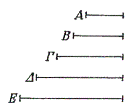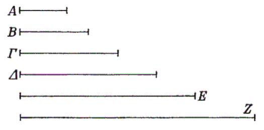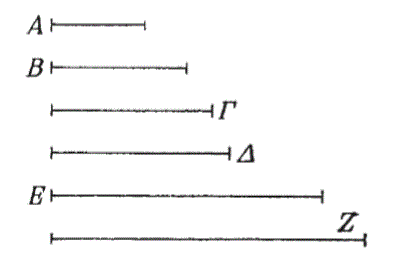 Κείσθω γὰρ τῷ μὲν ΒΓ ἴσος ὁ ΖΚ, τῷ δὲ Δ ἴσος ὁ ΖΛ. καὶ ἐπεὶ ὁ ΖΚ τῷ ΒΓ ἴσος ἐστίν, ὧν ὁ ΖΘ τῷ ΒΗ ἴσος ἐστίν, λοιπὸς ἄρα ὁ ΘΚ λοιπῷ τῷ ΗΓ ἐστιν ἴσος. καὶ ἐπεί ἐστιν ὡς ὁ ΕΖ πρὸς τὸν Δ, οὕτως ὁ Δ πρὸς τὸν ΒΓ καὶ ὁ ΒΓ πρὸς τὸν Α, ἴσος δὲ ὁ μὲν Δ τῷ ΖΛ, ὁ δὲ ΒΓ τῷ ΖΚ, ὁ δὲ Α τῷ ΖΘ, ἔστιν ἄρα ὡς ὁ ΕΖ πρὸς τὸν ΖΛ, οὕτως ὁ ΛΖ πρὸς τὸν ΖΚ καὶ ὁ ΖΚ πρὸς τὸν ΖΘ. διελόντι, ὡς ὁ ΕΛ πρὸς τὸν ΛΖ, οὕτως ὁ ΛΚ πρὸς τὸν ΖΚ καὶ ὁ ΚΘ πρὸς τὸν ΖΘ. ἔστιν ἄρα καὶ ὡς εἷς τῶν ἡγουμένων πρὸς ἕνα τῶν ἑπομένων, οὕτως ἅπαντες οἱ ἡγούμενοι πρὸς ἅπαντας τοὺς ἑπομένους· ἔστιν ἄρα ὡς ὁ ΚΘ πρὸς τὸν ΖΘ, οὕτως οἱ ΕΛ, ΛΚ, ΚΘ πρὸς τοὺς ΛΖ, ΖΚ, ΘΖ. ἴσος δὲ ὁ μὲν ΚΘ τῷ ΓΗ, ὁ δὲ ΖΘ τῷ Α, οἱ δὲ ΛΖ, ΖΚ, ΘΖ τοῖς Δ, ΒΓ, Α· ἔστιν ἄρα ὡς ὁ ΓΗ πρὸς τὸν Α, οὕτως ὁ ΕΘ πρὸς τοὺς Δ, ΒΓ, Α. ἔστιν ἄρα ὡς ἡ τοῦ δευτέρου ὑπεροχὴ πρὸς τὸν πρῶτον, οὕτως ἡ τοῦ ἐσχάτου ὑπεροχὴ πρὸς τοὺς πρὸ ἑαυτοῦ πάντας· ὅπερ ἔδει δεῖξαι.