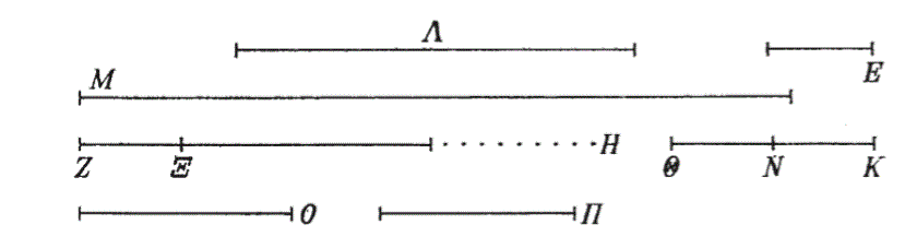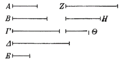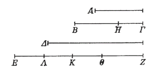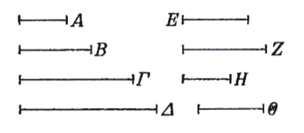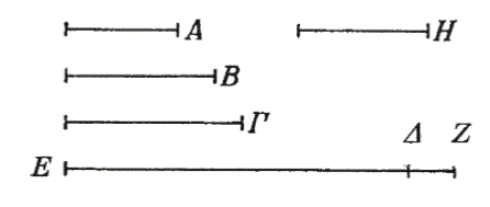 Ἔστωσαν ὁποσοιδηποτοῦν ἀριθμοὶ ἑξῆς ἀνάλογον οἱ Α, ΒΓ, Δ, ΕΖ ἀρχόμενοι ἀπὸ ἐλαχίστου τοῦ Α, καὶ ἀφῃρήσθω ἀπὸ τοῦ ΒΓ καὶ τοῦ ΕΖ τῷ Α ἴσος ἑκάτερος τῶν ΒΗ, ΖΘ· λέγω, ὅτι ἐστὶν ὡς ὁ ΗΓ πρὸς τὸν Α, οὕτως ὁ ΕΘ πρὸς τοὺς Α, ΒΓ, Δ.